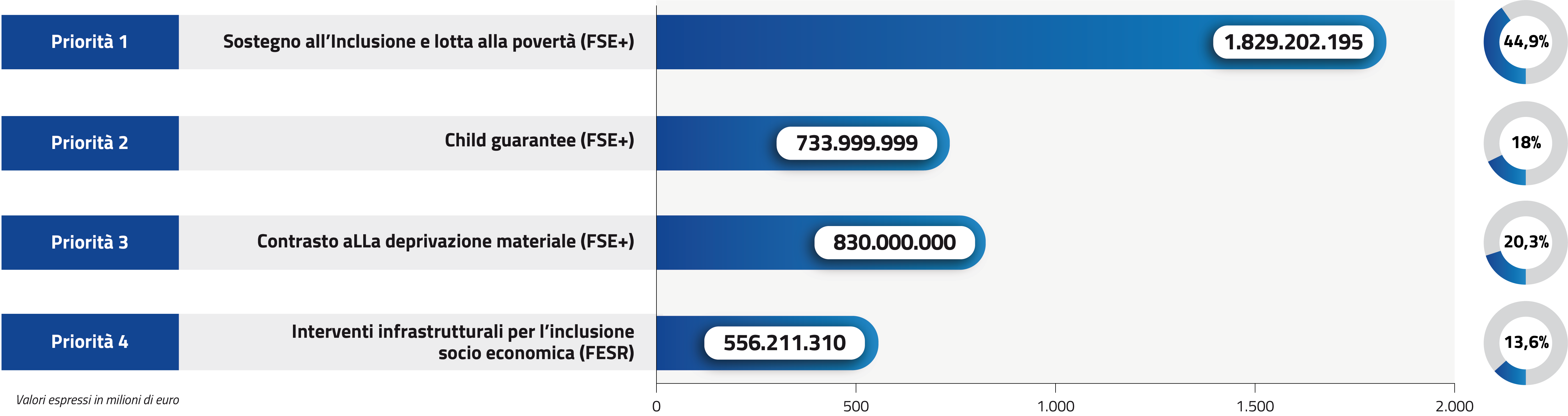 Il Programma ha un budget di oltre 4 miliardi di euro, tra cofinanziamento nazionale e finanziamento europeo FSE+ e FESR.