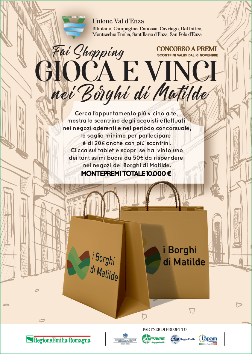 Ogni settimana in un Comune della Val d’Enza -fino al 25 aprile 2024- sarà presente un gazebo “I Borghi di Matilde” che gestirà le estrazioni.