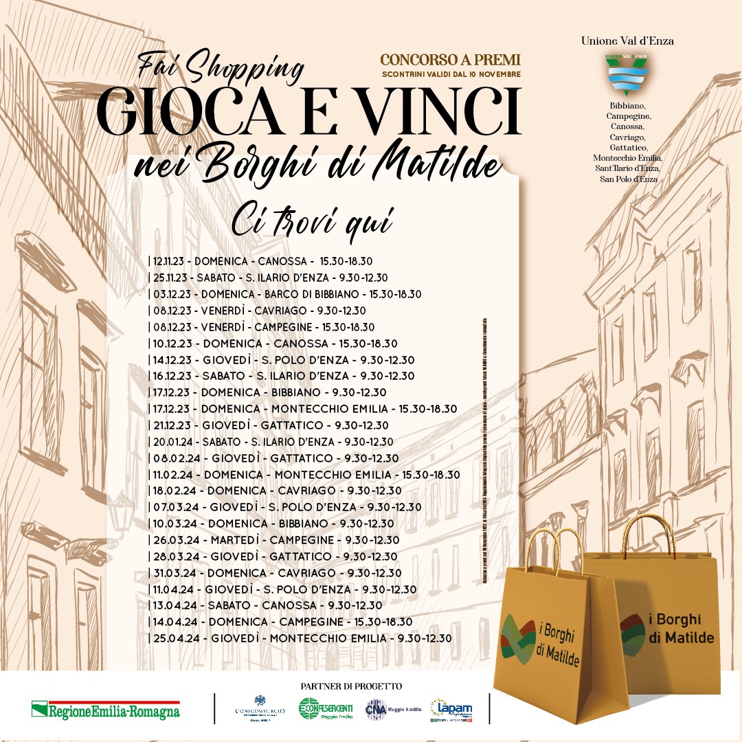 Ogni settimana in un Comune della Val d’Enza (fino al prossimo 25 aprile) sarà presente un gazebo “I Borghi di Matilde” che gestirà le estrazioni.