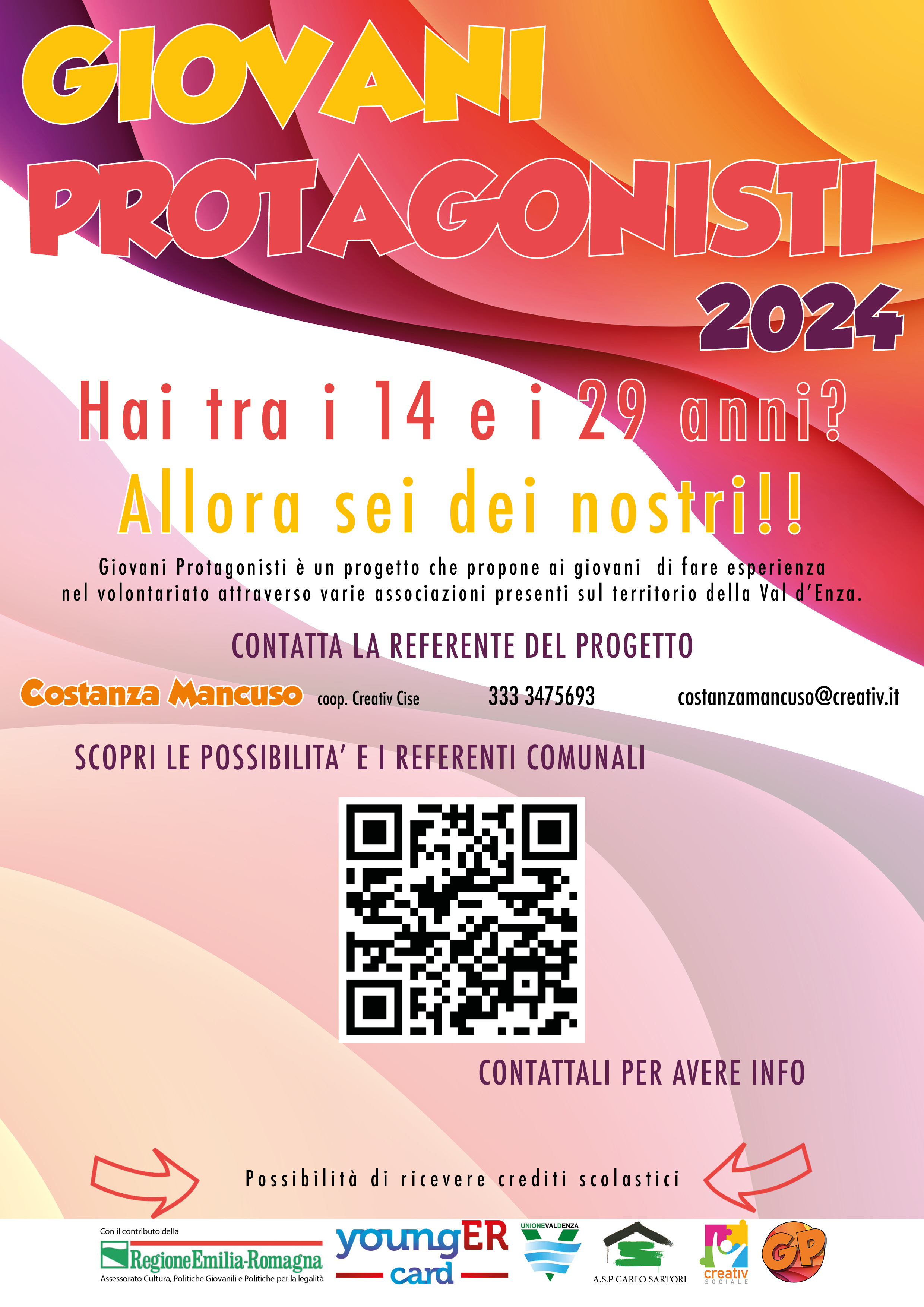 Giovani Protagonisti è un progetto regionale che l’Unione Val d’Enza attivo dal 2017, che propone ai giovani opportunità di volontariato su tutta la Val d’Enza. Negli anni hanno aderito centinaia di ragazzi, che si sono messi a disposizione di servizi pubblici, cooperative sociali e associazioni di volontariato.Le attività sono collegate alla Younger card, che consente di accedere a sconti nei negozi convenzionati e di ottenere crediti scolastici.