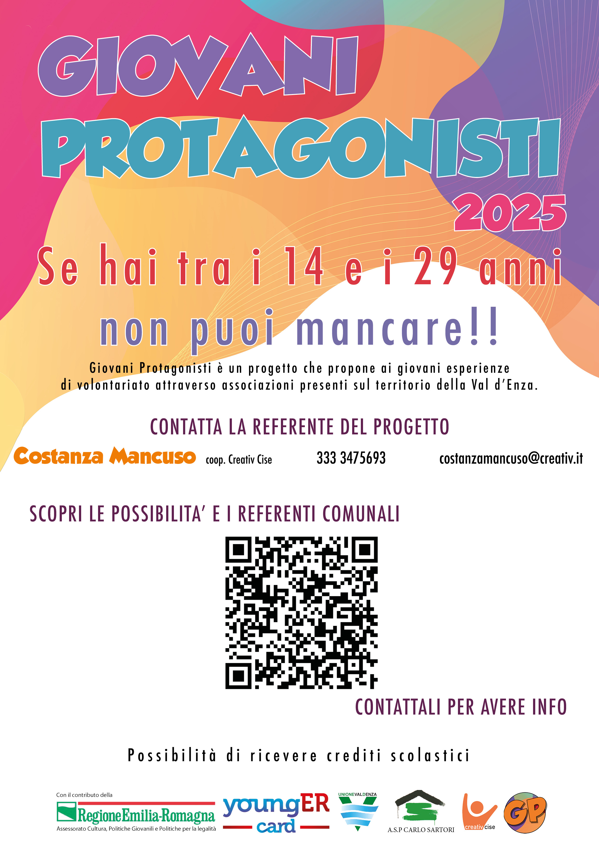 Giovani Protagonisti è un progetto regionale che l’Unione Val d’Enza attivo dal 2017, che propone ai giovani opportunità di volontariato su tutta la Val d’Enza. Negli anni hanno aderito centinaia di ragazzi, che si sono messi a disposizione di servizi pubblici, cooperative sociali e associazioni di volontariato.