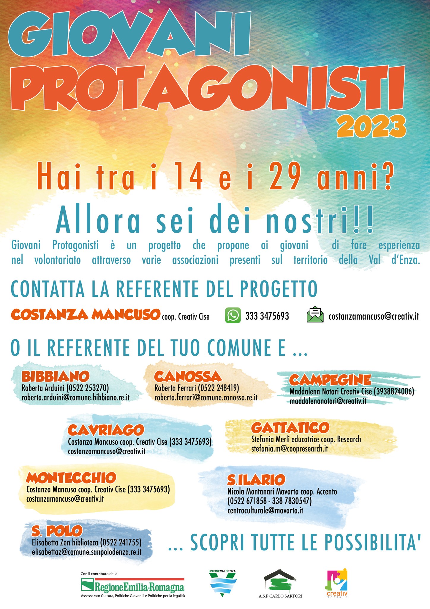 🟥 Giovani Protagonisti è un progetto regionale che l’Unione Val d’Enza attivo dal 2017, che propone ai giovani opportunità di volontariato su tutta la Val d’Enza. Negli anni hanno aderito centinaia di ragazzi, che si sono messi a disposizione di servizi pubblici, cooperative sociali e associazioni di volontariato.