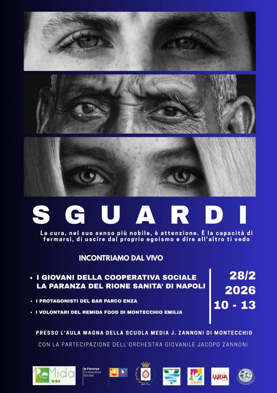 Il Servizio Sociale di Montecchio Emilia desidera invitarvi a partecipare all'evento "Sguardi": un momento di consapevolezza e confronto sul tema della cura, che si terrà il 28 febbraio 2026, dalle ore 10:00 alle 13:00, presso l'Aula Magna della Scuola Media Jacopo Zannoni nel Comune di Montecchio Emilia.