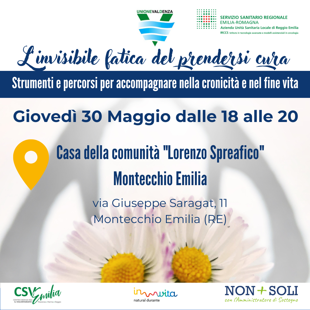 L’invisibile fatica del “prendersi cura”. Strumenti e percorsi per accompagnare nella cronicità o nel fine vita. E’ un tema pregnante, perennemente attuale e insieme sempre complesso da affrontare, quello di cui si parlerà giovedì 30 maggio a Montecchio Emilia, in un’iniziativa promossa in collaborazione con CSV Emilia e con il distretto Ausl di Montecchio in occasione del Caregiver Day 2024.