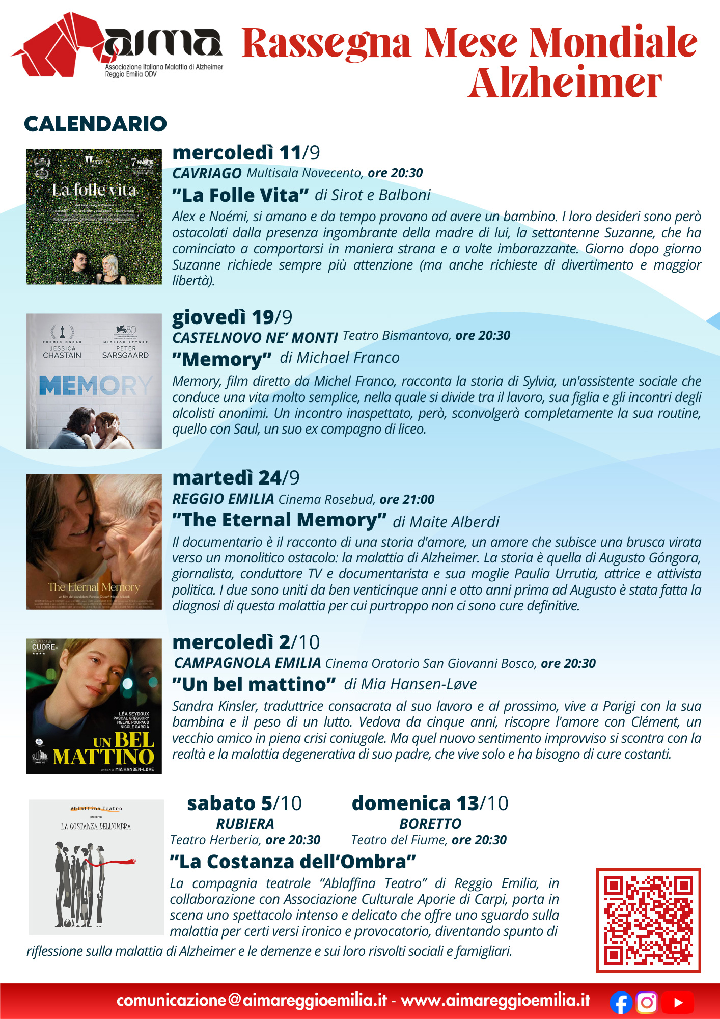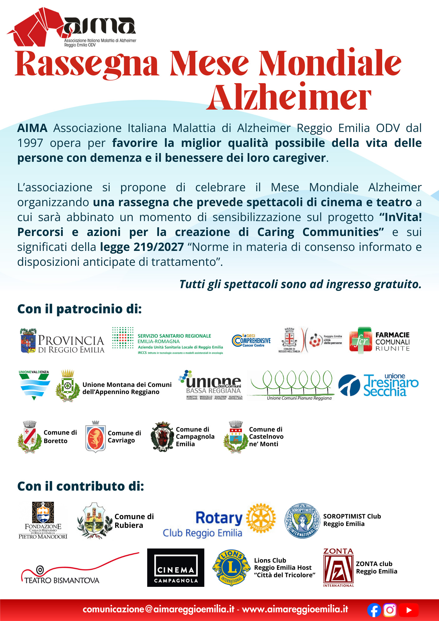 AIMA Reggio Emilia ODV in occasione del Mese Mondiale Alzheimer organizza spettacoli di cinema e di teatro con momenti di sensibilizzazione sul progetto "InVita! Percorsi e azioni per la creazione di Caring Communities" e sulla legge 219/2017 "Norme in materia di consenso informato e di disposizioni anticipate di trattamento".
