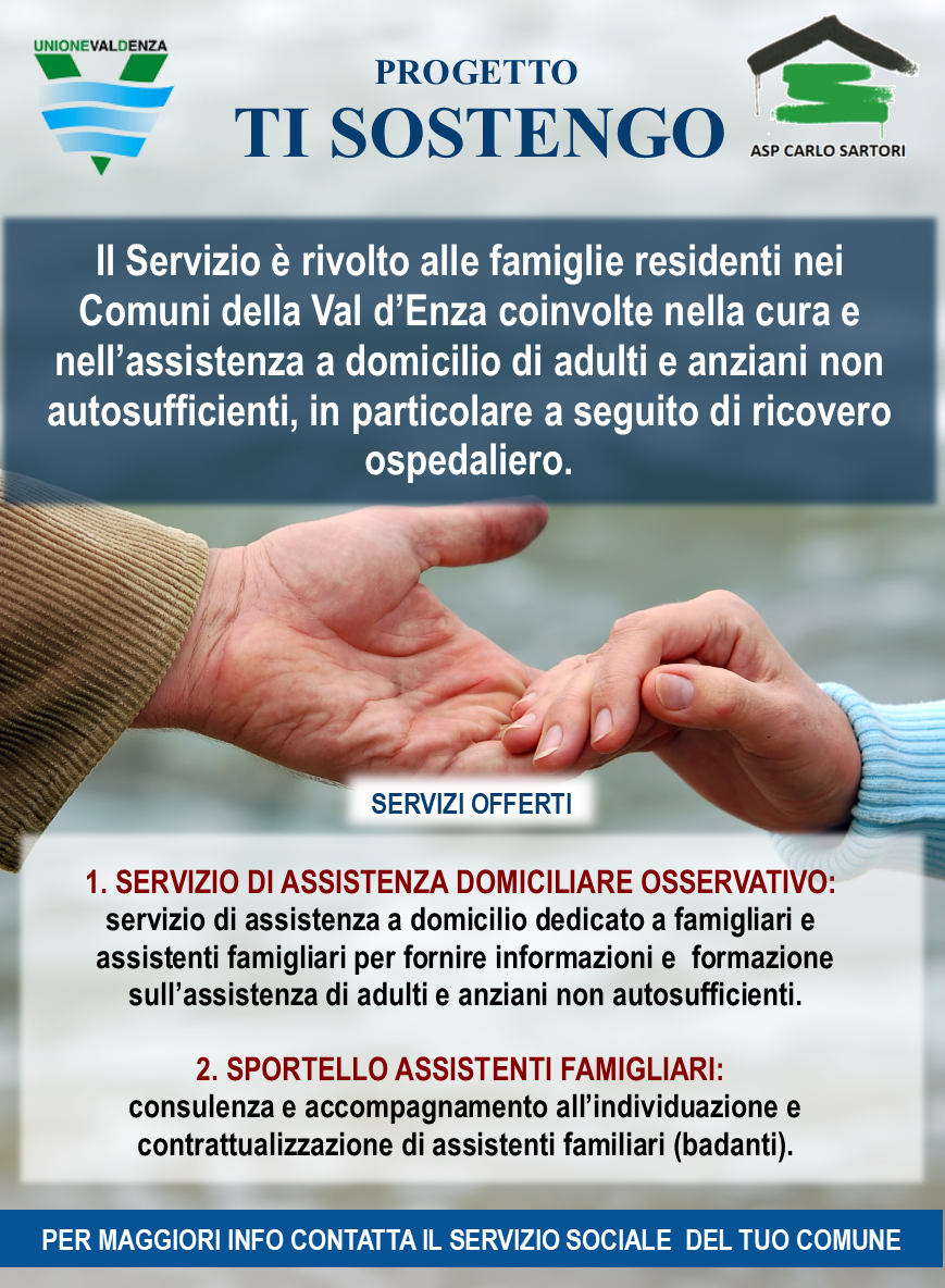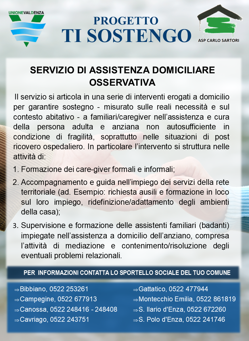 SERVIZIO DI ASSISTENZA DOMICILIARE OSSERVATIVO: servizio di assistenza a domicilio dedicato a famigliari e assistenti famigliari per fornire informazioni e formazione sull’assistenza di adulti e anziani non autosufficienti.