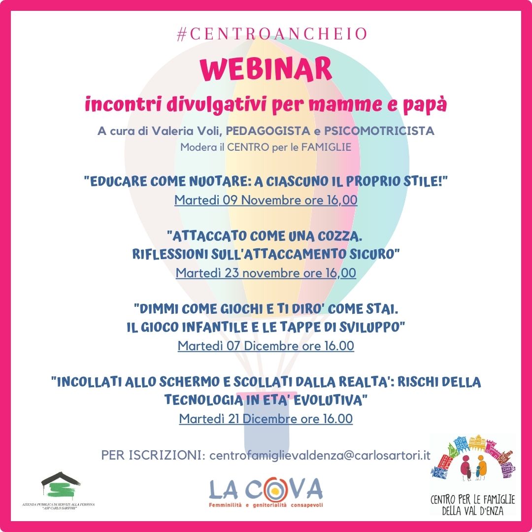 All'interno del progetto "Genitori in viaggio" un nuovo ciclo di incontri divulgativi on line su stili educativi, attaccamento, gioco e tecnologie, promossi dal Centro per le Famiglie e dall'Associazione di Promozione Sociale La Cova.