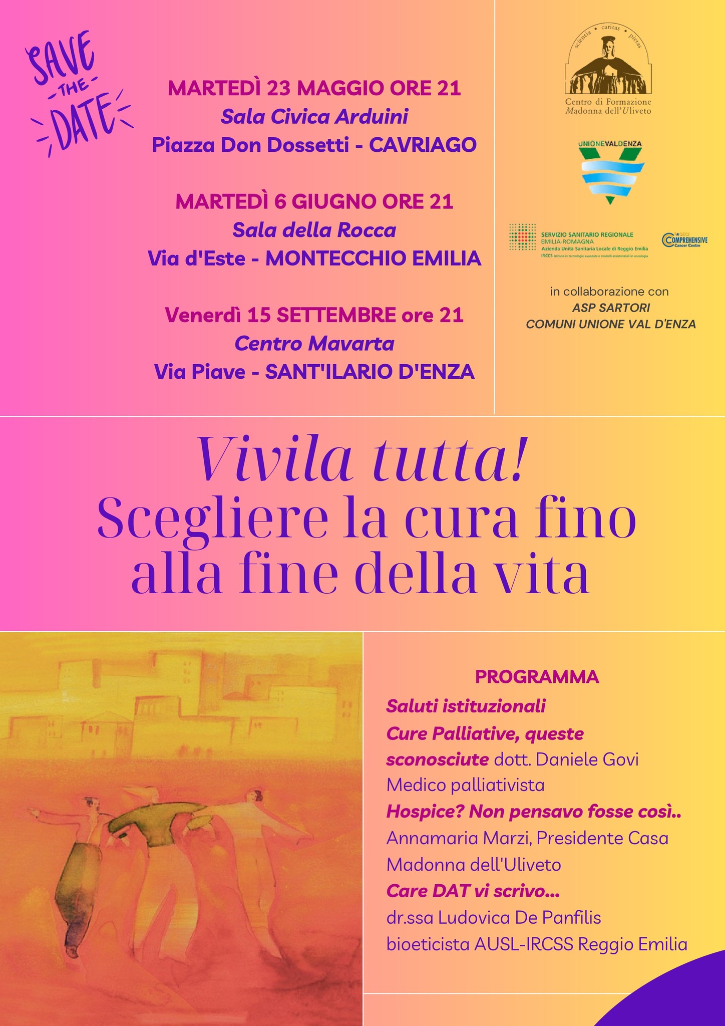 L'iniziativa ha l'obiettivo di far conoscere le opportunità previste dalle DAT (Disposizioni Anticipate di Trattamento) e di informare sulla Rete locale di Cure Palliative e sui servizi offerti alle persone in fase avanzata e/o cronica di malattia.