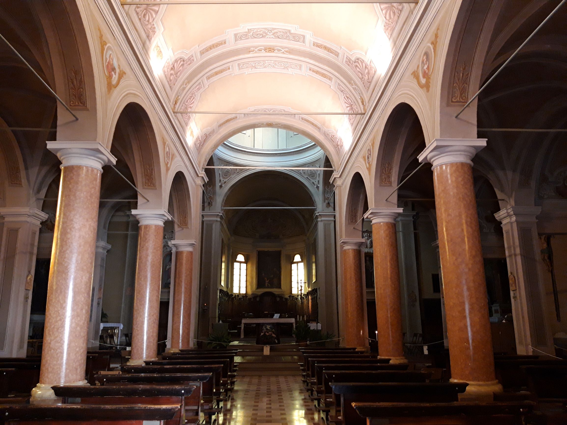 L'edificio è a croce latina con tre navate in corrispondenza delle tre porte sulla facciata. La facciata, orientata a levante, è suddivisa da lesene. Sopra all'ingresso principale si trova una trifora sovrastata da frontespizio triangolare. Si evidenzia la bella e luminosa cupola con lanterna sulla crociera.