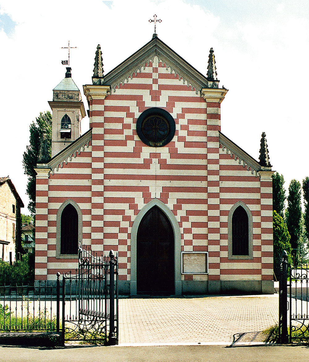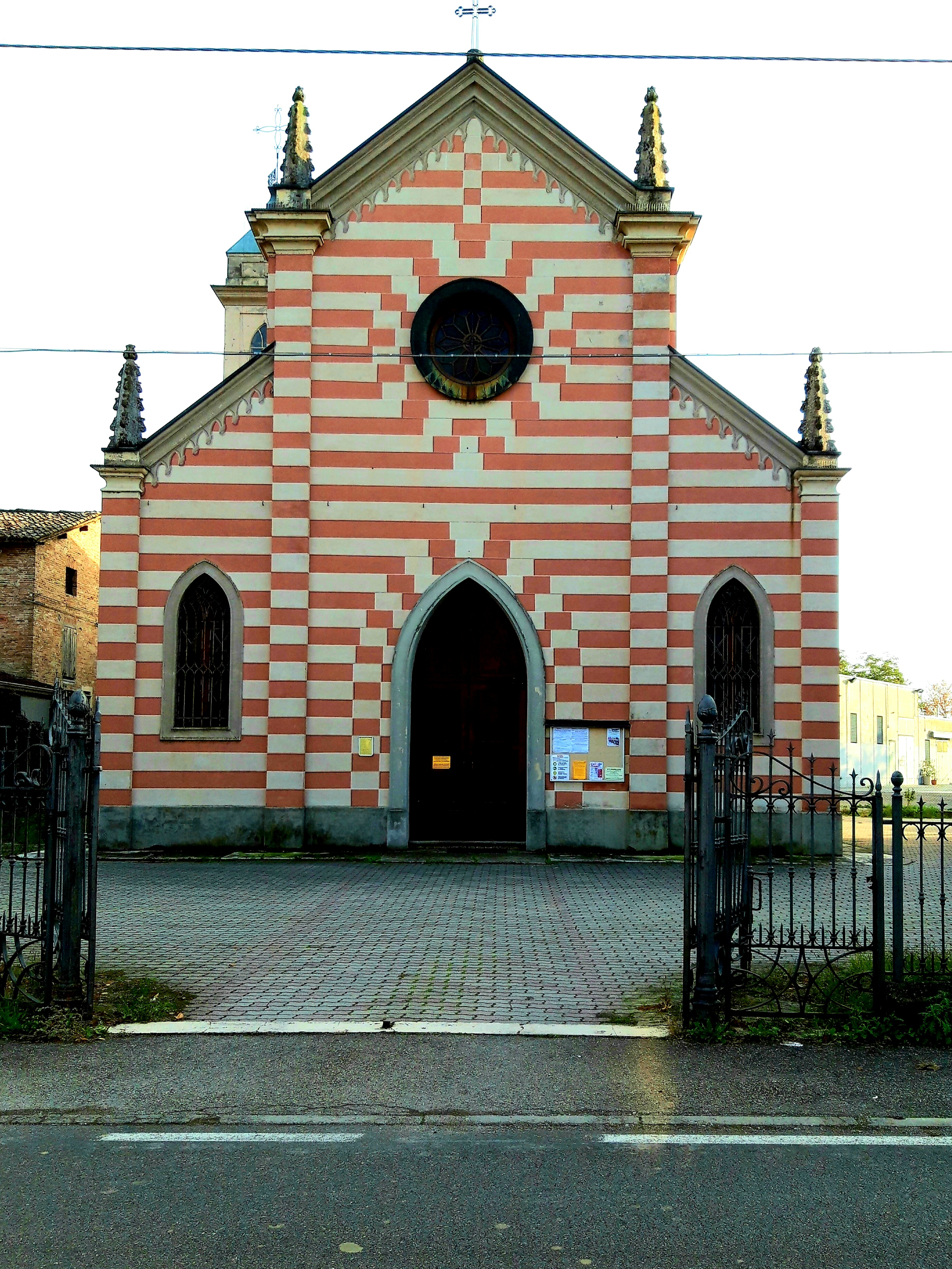 La facciata, rivolta a Ovest, è di stile neogotico. La caratterizzano linee altenate chiare e scure, pinnacoli ed archi a sesto acuto.