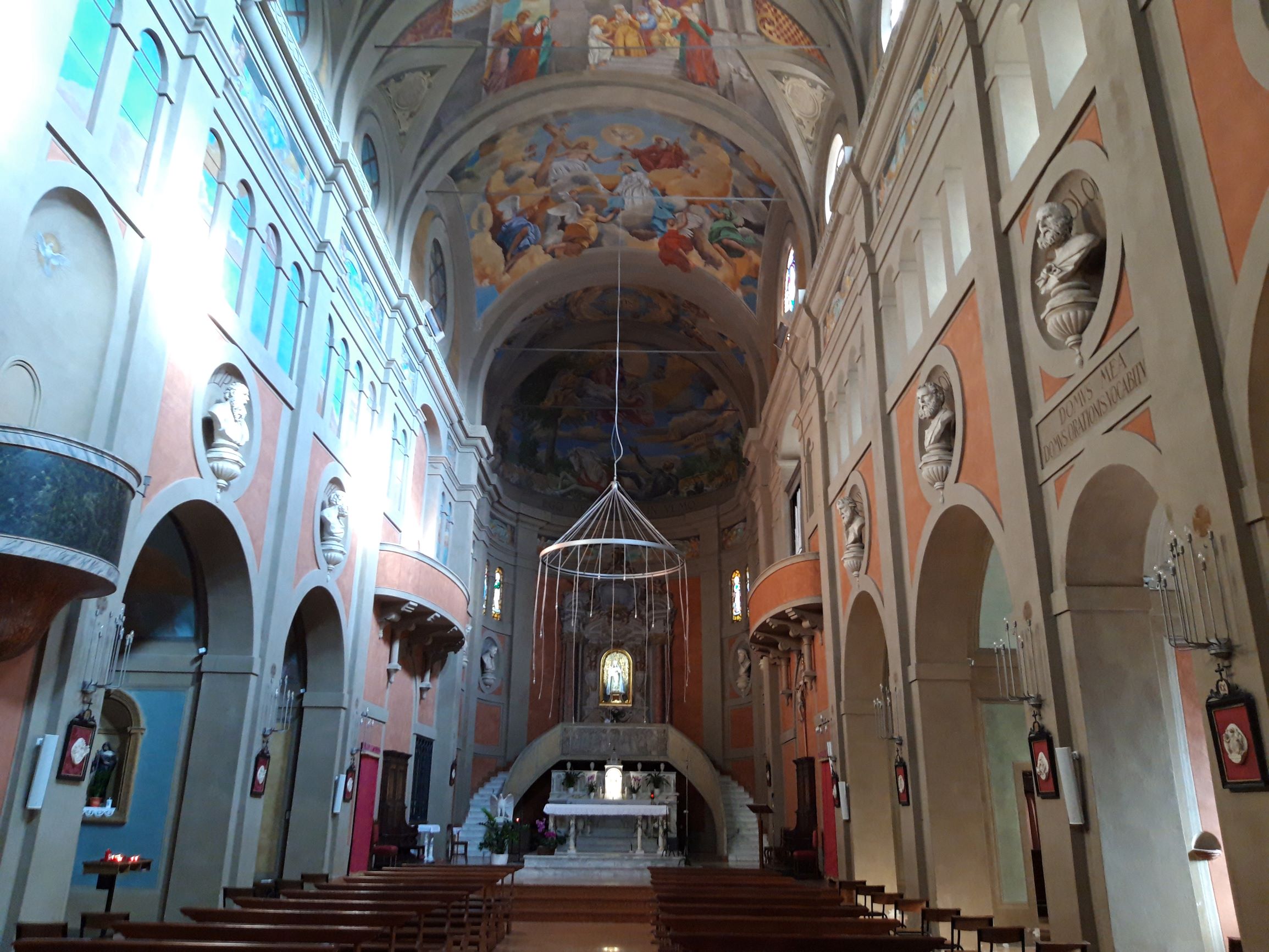 L'interno è a navata unica, ai cui lati si aprono quattro cappelle per parte con dipinti e affreschi settecenteschi e ottocenteschi. Sopra di esse si trova un loggiato, tra i cui archetti e le cappelle stesse si aprono nicchie circolari con busti.