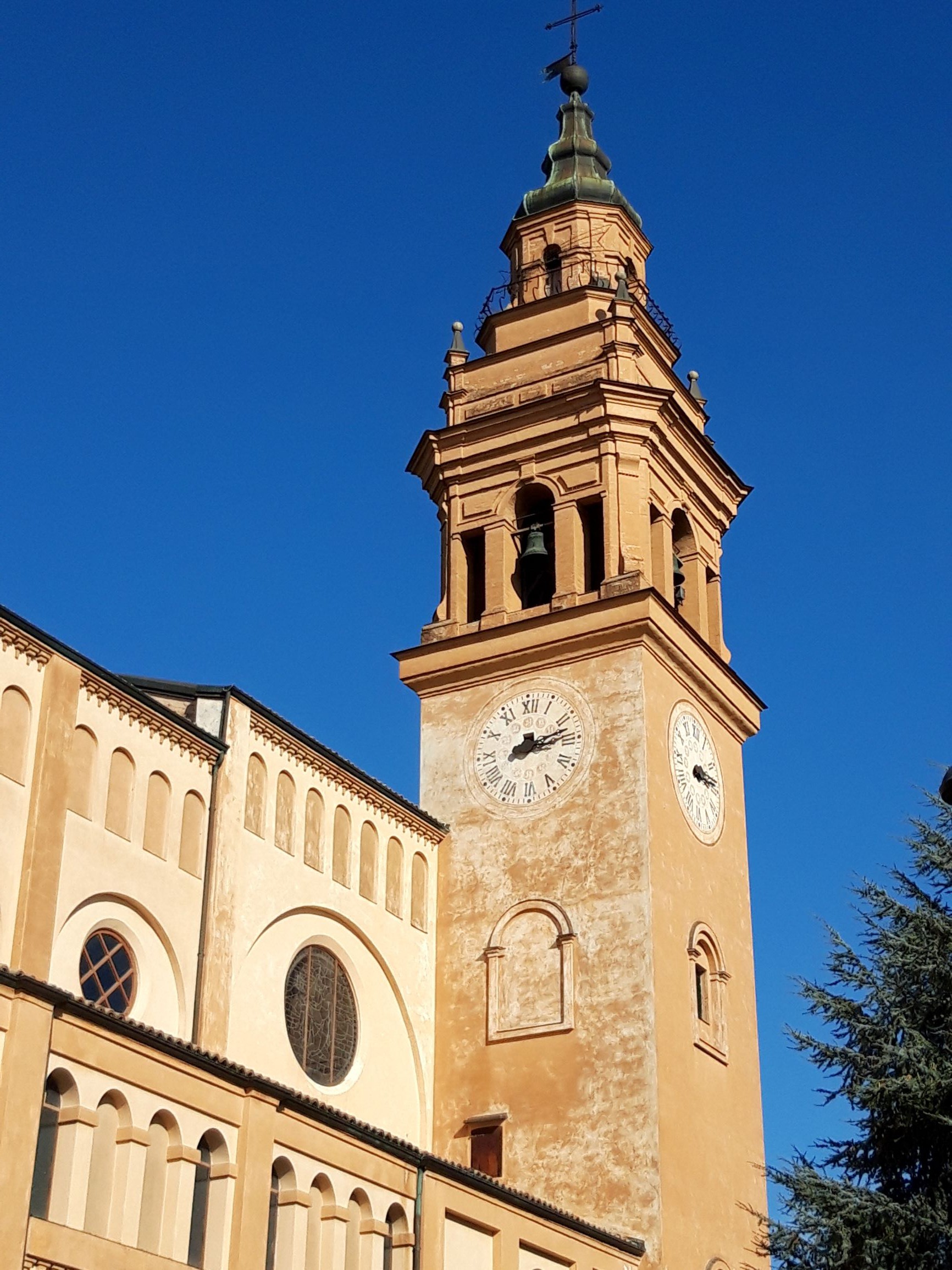 Il campanile a cuspide, alto oltre 40 metri, che si eleva sul fianco posteriore ed è unito all'abside coperta da un edificio adiacente, presenta una interessante struttura barocca.