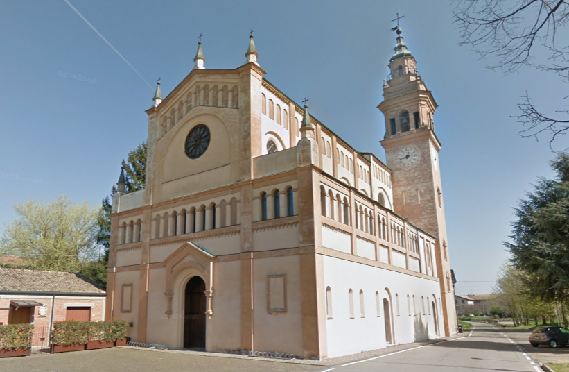L'elegante facciata facciata settecentesca è orientata liturgicamente, tripartita ed adornata con lesene. Sul portale timpanato si apre un rosone con vetrata moderna. Sono presenti motivi decorativi in laterizio e fasce ad archetti ciechi. Il cornicione è sormontato da acroteri con elemento piramidale, sfera e croce in vertice.